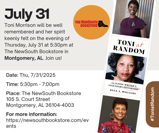 What's this title, Toni at Random, you say? We're glad you asked! Bet you're sorry you missed this book talk that uncovers Toni Morrison's brilliant legacy as an editor at NewSouth Bookstore. We talked about how Morrison shaped Black literature from behind the scenes—long before and alongside her celebrated novels. Even devoted Morrison fans walked away with something new and inspiring.